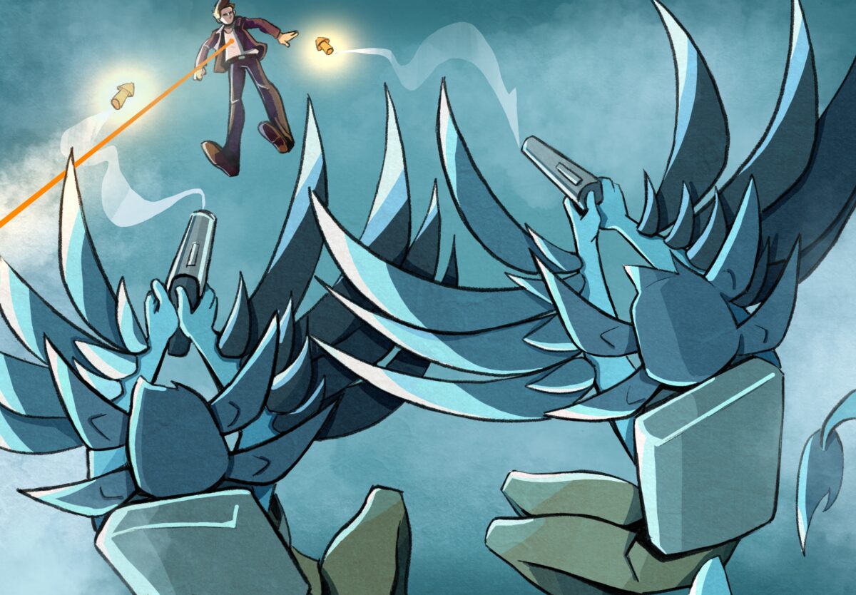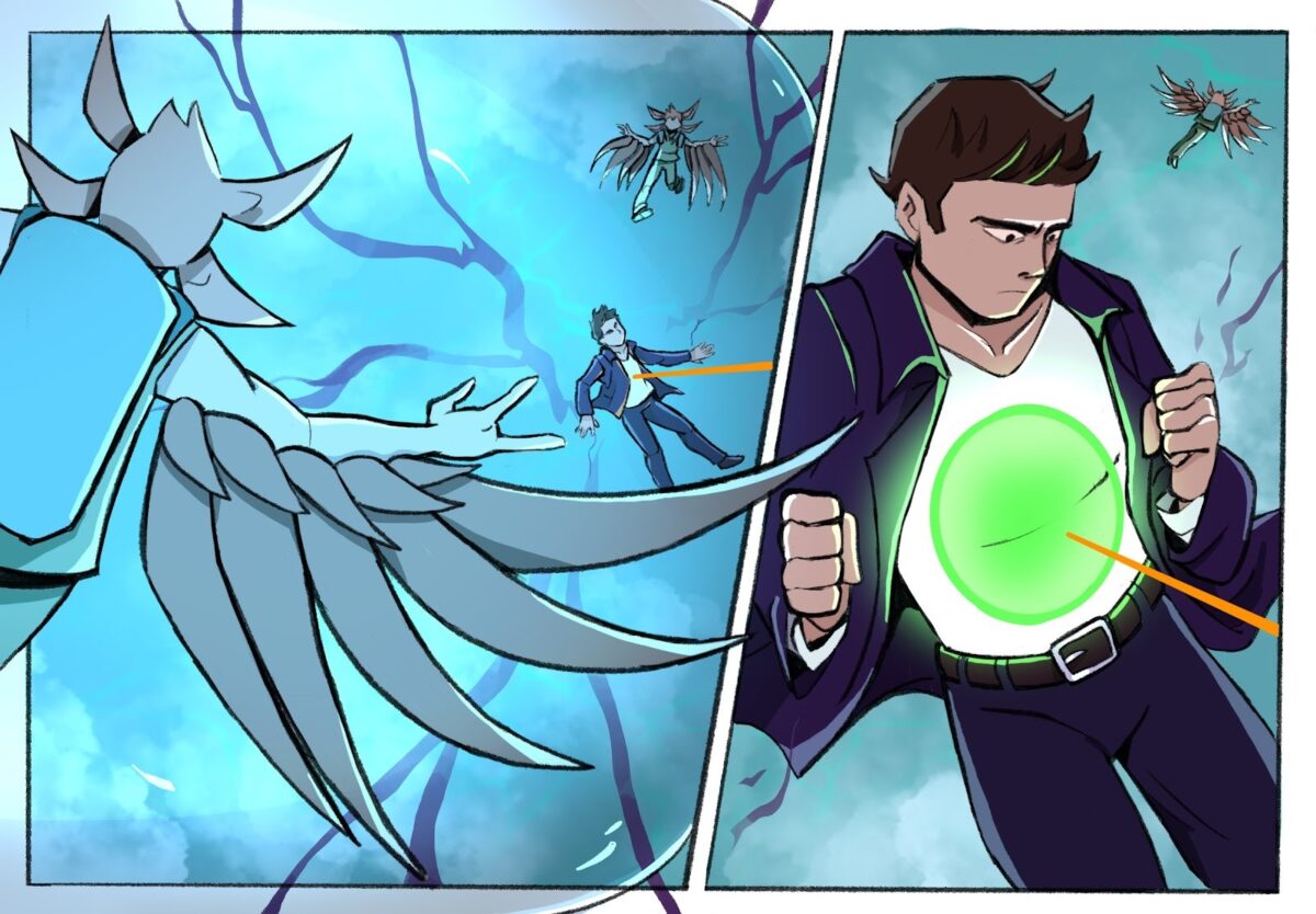 The blue ball was still around them. Morris couldn’t hit any ranged attack against them, as it protected the flying rodents from harm. He responded by flying to them himself. Alex threw knives at him, but it didn’t really have an effect, as Morris either dodged or just took the hit.