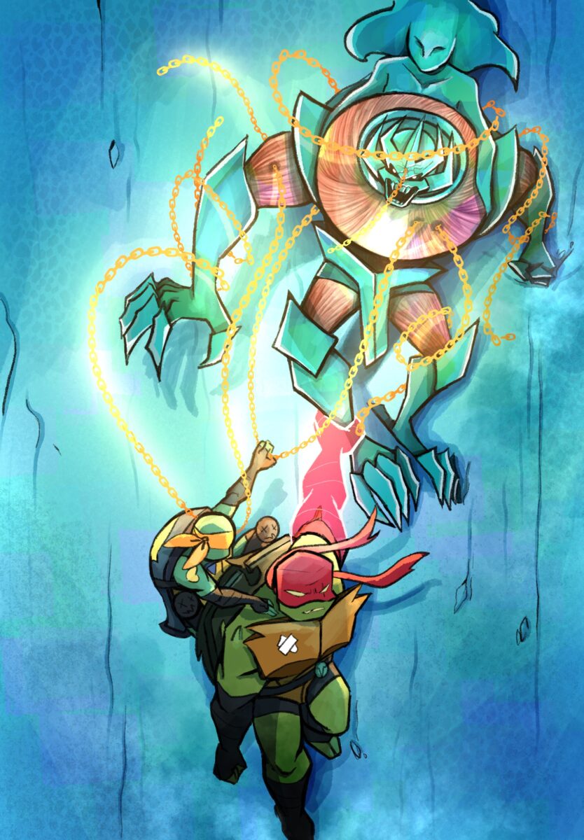 Then… the form of Morris’s mother was formed on his back, hugging him tightly. He was ready to end it all for his own family. Jumping to Raph, he completely overpowered the red mystic giant of him, while in the meantime Mikey and Draxum tried to do something with their chains and vines, slightly hurting the armor. Raph tried to defend himself. even without his giant. But… his arm was ripped off by Morris, creating a metal-like tentacle with muscle in it.