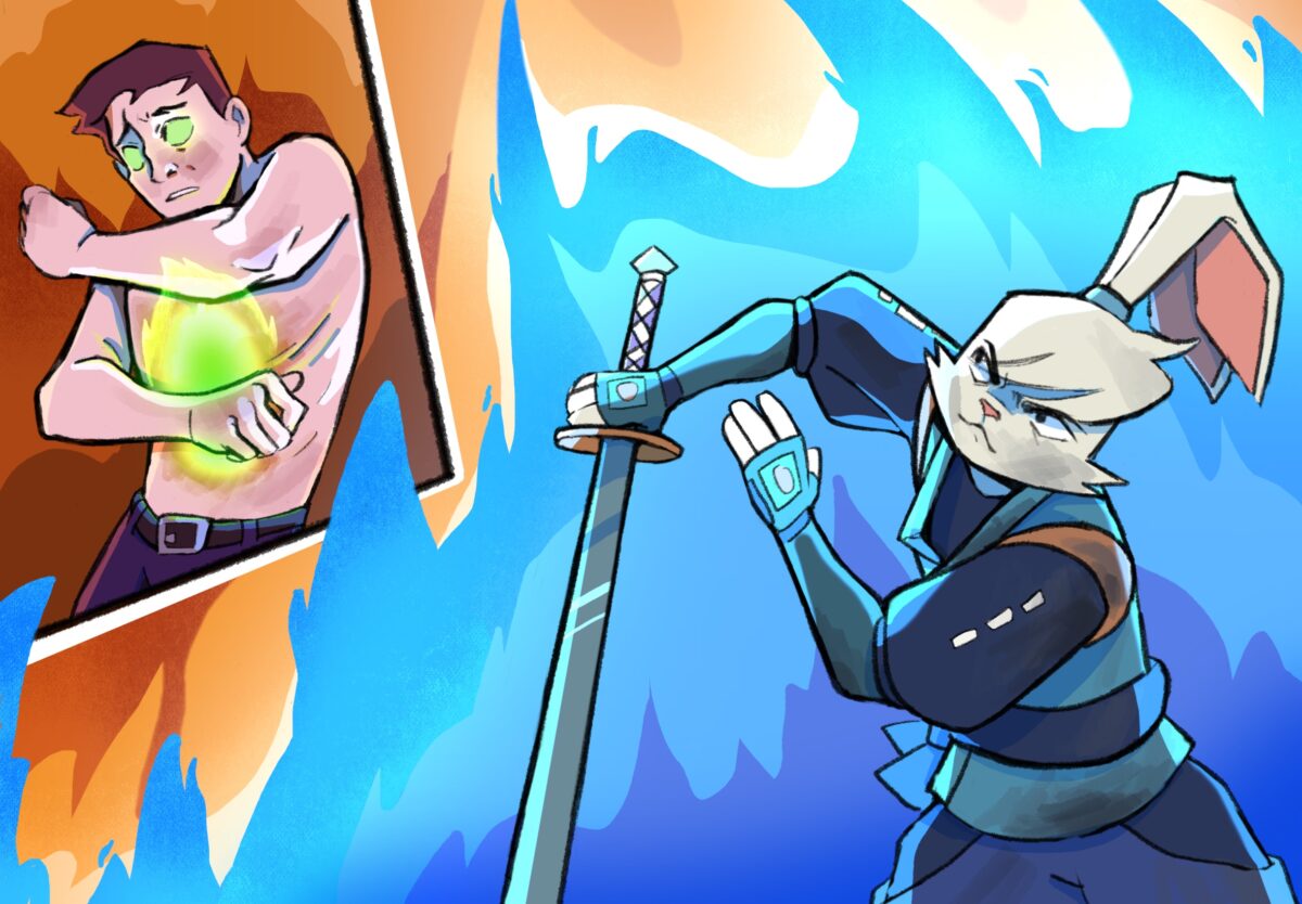 Yuichi was coughing up blood, but as Morris ran towards the samurai, Yuichi was able to clash again in time. The rabbit gasped, shocked that Morris actually knew how to fight with a blade like that.