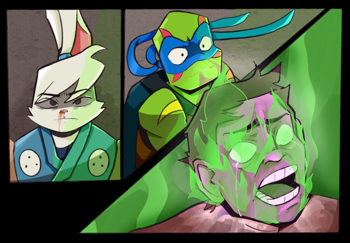Leo immediately felt disoriented, and couldn’t do anything. He didn’t see Morris, he saw the Kraang from two years ago. Yuichi saw the arm and gasped, knowing what was gonna happen.